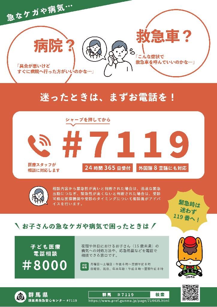 迷ったときはまずお電話を! #7119 2025-10-01 医師会館林市邑楽郡 会員, 地域 群馬県では、救急安心センター(#7119)を令和7年10月1日から開始です。救急車を呼んだ方がよいのか、今すぐ病院に行った方がいいのかなどで迷った際の相談先として、相談員(看護師)から受診の必要性、対処方法等の適切な助言等の救急電話相談や医療機関案内を受けることができる電話相談窓口を開設します。 #7119ダウンロード 詳しくは群馬県ホームページよりご確認ください。