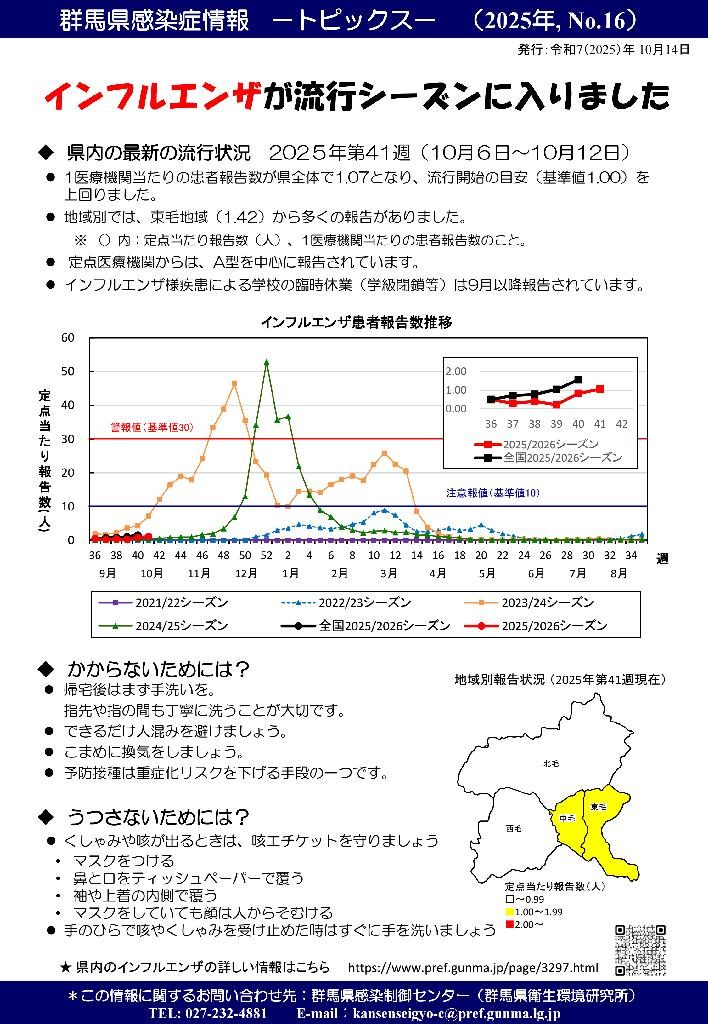 群馬県感染症情報 2025年第41週(10/6-10/12) をお知らせいたします。