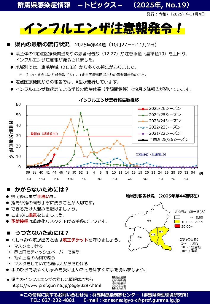 ・ インフルエンザは注意報が発令されました。また、15歳未満の年齢層を中心にマイコプラズマ肺炎の報 告も続いています。これらの感染症はいずれも、飛沫感染や接触感染によってうつります。咳やくしゃみが 出るときは、「マスクを着用する」「鼻や口をティッシュで覆う」「袖や上着の内側で口や鼻を覆う」などの 咳エチケットを心がけましょう。定期的な換気も感染予防に有効です。
