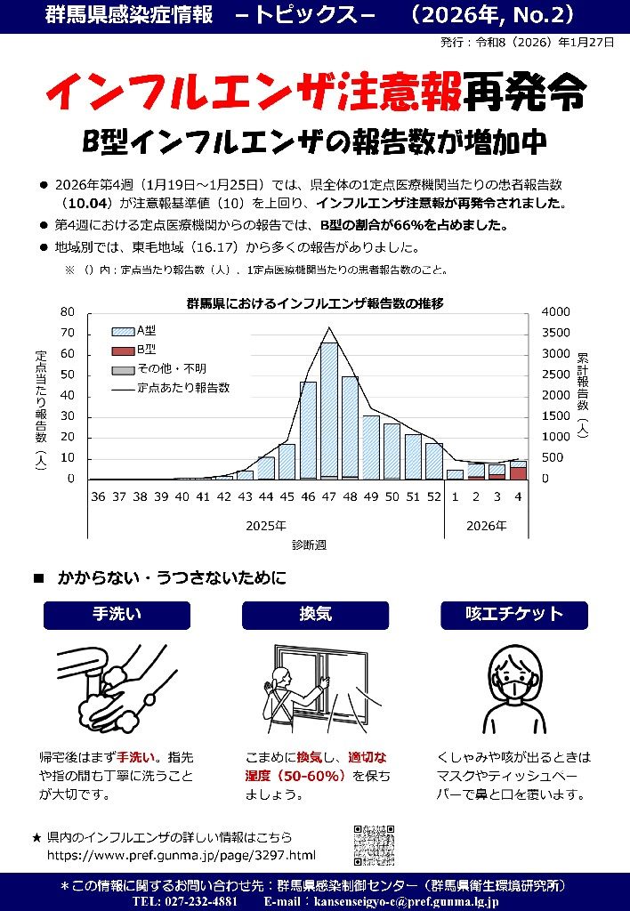 群馬県感染症情報の週報【2026年第4週(1/19-1/25) 】をお知らせいたします。