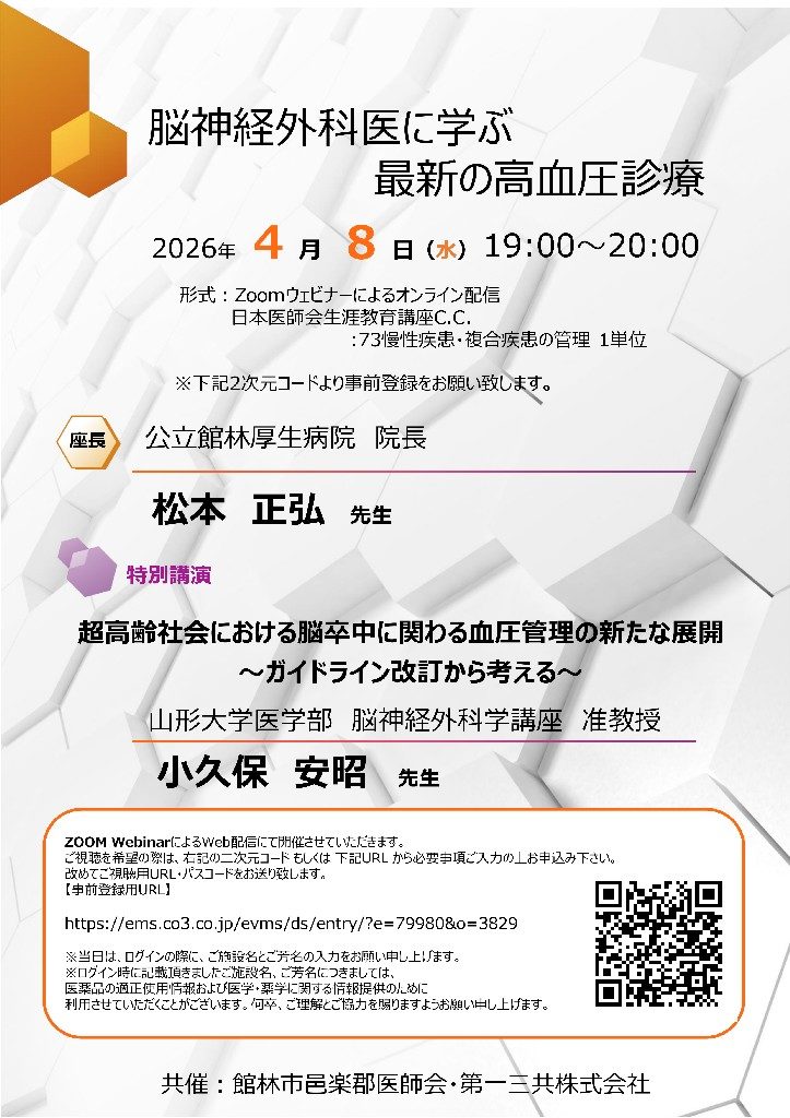 学術講演会のご案内【4月8日・水】 2026-03-24 医師会館林市邑楽郡 会員, 学術講演会 演 題 超高齢社会における脳卒中に関わる血管管理の新たな展開 ~ガイドライン改訂から考える~ 日 時 2026年4月8日(月) 19:00~20:00 開催方法 web配信 参加申込はこちらからお願いいたします。