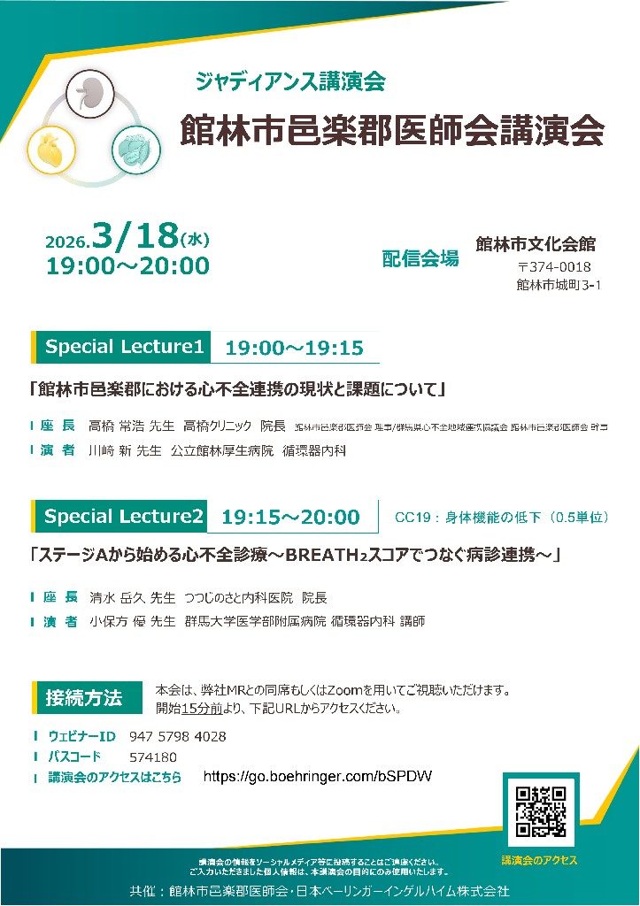 ①館林市邑楽郡における心不全連携の現状と課題について ②ステージAから始める心不全診療 ~BREATH2スコアでつなぐ病診連携~ |